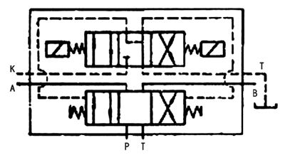 用途與特征: 電液換向閥是由電磁換向閥和液動(dòng)換向閥組合而成。電磁換向閥起先導(dǎo)控制作用,使液動(dòng)滑閥換向進(jìn)行油路卸載、順序動(dòng)作以改變油流方向等來(lái)控制液壓系統(tǒng)中的執(zhí)行元件的運(yùn)作(如油缸的往返、油馬達(dá)的回轉(zhuǎn)等),起到與單獨(dú)的電磁換向閥相同的作用。 電液換向閥是用較小的電磁先導(dǎo)閥來(lái)控制大流量的液動(dòng)換向閥來(lái)?yè)Q向,在需要流量較大的自動(dòng)化液壓系統(tǒng)中得到廣泛采用。 電液換向閥圖形符號(hào): 型號(hào)說(shuō)明: