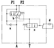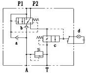 3.當轉向液壓系統助力泵出現故障或在行駛過程中發(fā)動機突然停止工作時,無轉向壓力油從P1口進入應急閥。這時應急閥主閥芯在彈簧力作用下復位,主閥芯和背壓閥c同時關閉;瞬間則由應急泵提供壓力油通過單向閥b(此時單向閥a關閉)分配到A口,壓力油經P2→b→A口流出進入液壓轉向器的分配閥使其正常工作,驅動液壓轉向器的活塞運動從而達到應急轉向的目的。