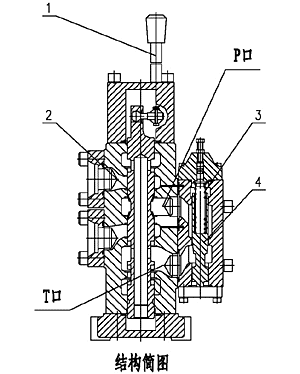 2、主閥的方向切換及節(jié)流原理,當(dāng)手柄(序1)處于中間位置時工作油口(A、B口)封閉,從油泵排出的油液從P口回到T口卸荷,油馬達(dá)停止。當(dāng)手柄處于右側(cè)時,主閥芯(序2)向上移動,從P口流入的油液通過節(jié)流口流到A口,再從A口流出驅(qū)使油馬達(dá)轉(zhuǎn)動,經(jīng)過油馬達(dá)后的油液從B口回到T口,這樣靠手柄板動不同的傾斜角度,使主閥芯處于不同的位置來調(diào)節(jié)節(jié)流口的開度大小,以達(dá)到油馬達(dá)的轉(zhuǎn)速調(diào)節(jié)。