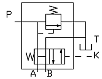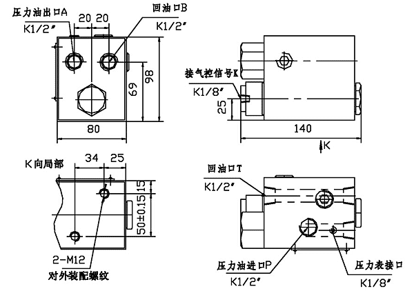 EQ340氣控分配閥是常開式二位四通換向閥與直動(dòng)式溢流閥的復(fù)合?捎糜谝磺杏袎嚎s空氣源的工程機(jī)械、運(yùn)輸機(jī)械等的液壓系統(tǒng)中,能可靠地控制工作油缸的舉升,有效地防止液壓系統(tǒng)過載,實(shí)現(xiàn)系統(tǒng)卸荷,起到安全、節(jié)能作用。有氣控信號(hào)時(shí),二位四通換向閥換向,P與T斷開與A接通,系統(tǒng)在溢流閥限定壓下工作,溢流閥起安全作用。無氣控信號(hào)時(shí),換向閥在彈簧作用下復(fù)位,P、A與T接通,系統(tǒng)卸荷。