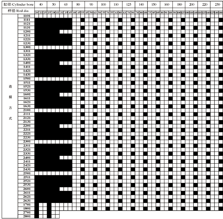 用戶(hù)選型完后,請(qǐng)將選用的主參數(shù)(缸徑、活塞桿徑)及連接方式編號(hào)與下表進(jìn)行核對(duì),以免選型差錯(cuò)。