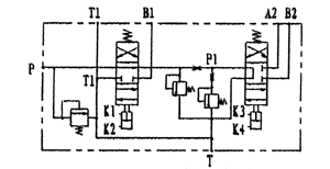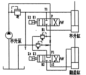 當(dāng)氣控多路閥處于中間位置時(shí),使車(chē)廂舉升位置保持不變,同時(shí)系統(tǒng)壓力油供另一組帶附加功能(翻蓋功能)的閥片工作即可實(shí)現(xiàn)車(chē)廂翻蓋的閉合—展開(kāi)功能。該閥的工作原理示意圖如下