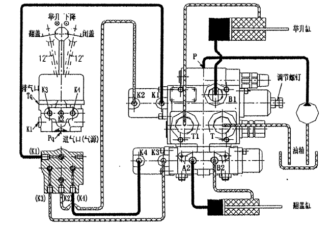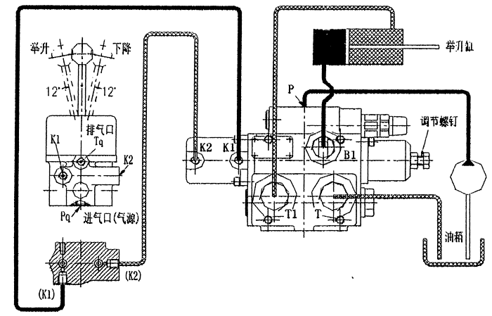 該閥先導(dǎo)控制部分以壓縮空氣為工作介質(zhì),通過(guò)氣缸動(dòng)作推動(dòng)閥芯開(kāi)閉而轉(zhuǎn)換工作機(jī)能,即實(shí)現(xiàn)車(chē)廂的舉升—中停—下降等功能。