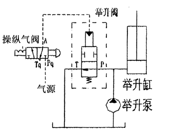 OJF—E15(20)L型氣控舉升閥的原始位置P口與T口是連通的(常開式結構)。該閥工作時,利用壓縮空氣通過氣缸推動閥芯封閉,油路由常通位置轉為工作位置,即實現(xiàn)車廂的舉升;切斷氣源P口與T口接通油液流入油箱,系統(tǒng)卸荷車廂下降。該閥的工作原理示意圖如下!