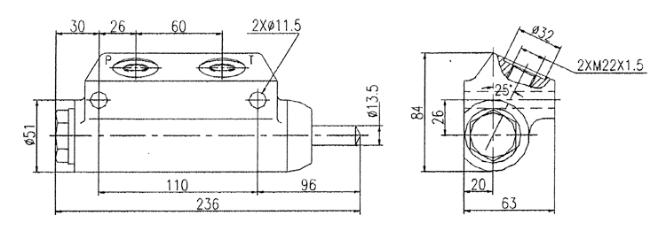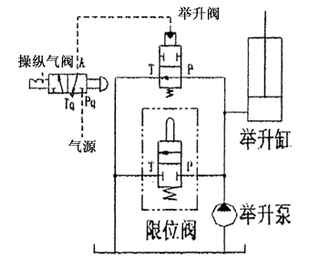 當(dāng)車廂舉升轉(zhuǎn)角達(dá)到一定角度時,舉升缸或其它限位機(jī)具觸及限位閥閥桿,閥內(nèi)P口與T口接通系統(tǒng)卸荷,切斷向舉升缸供油,車廂停止舉升,實(shí)現(xiàn)限位功能起舉升限位作限用。當(dāng)車廂舉升到最大轉(zhuǎn)角位置時,限位機(jī)構(gòu)將限位閥的限位桿壓下P口與T口接通,使舉升缸供油口與T口瞬間連通,舉升缸即下降一段距離(車廂舉升轉(zhuǎn)角變小),隨車廂舉升轉(zhuǎn)角變小限位閥的限位桿恢復(fù)原始狀態(tài)同時系統(tǒng)壓力油再次進(jìn)入舉升缸使其上升(車廂再次舉升到最大轉(zhuǎn)角位置)。在限位閥的限位桿行程范圍內(nèi)(即P口的開啟—閉合—開啟)現(xiàn)車廂下降—舉升—下降往復(fù)變化過程,使車廂產(chǎn)生輕微抖動有利于將車廂內(nèi)的殘留物體卸掉。該閥的工作原理示意圖如下!